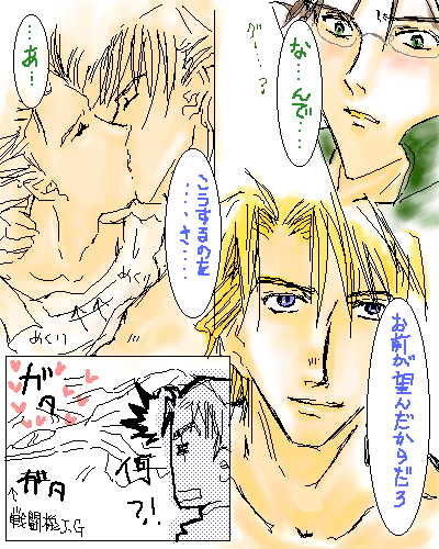 しのこさん、こんにちは! 昨日の私のバカー!!話の続きなんてどうでもいいからこっちをチェックするべきだった!!(笑) しのこさん、もう本当にありがとうございます。想像以上の素敵さでした! う〜ん、お絵描き掲示板で(しかもこのお絵かき掲示板て機能がわりと制限されてるんです)こんなに素晴らしいマンガが描けるなんてすごいです。 マンガが描けるというのもすごいんですけど、一枚できちんと話が落ちてるのが脅威的。私に短くキレイにまとめるコツを教えて下さいしのこさん!(笑) 短い話自体は簡単だと思うのです(私が書くとなんでも難しいんですけどもちろん)。でも短い話をきちんとまとめるのは至難のワザですよね。しのこさんホントに上手いなあ・・・憎・・・いやいやうらやましいです(笑)。 やっぱりこのマンガの絵は大人っぽいですよね。最初のコマの頬染めているハイネルも素敵ですが、2コマ目のグーのブルーアイズ(上目使いが!)とセリフにくらくらです。グーかっこよすぎ! キスシーンも非常に色っぽく、最後のコマのブーツホルツも必要以上にいい味出してます!必要以上に!(笑) それにしてもキスを受けてるハイネルがとても艶やかでキスしてるグーの表情がとても男っぽいです。グーハーって素敵です。 しのこさん・・・以前描いていただいたものとあわせて、ここにこうして載せておくのはもったいなさすぎですよ!カラーコピーでイベントに出しましょう!本気ですよ! なんなら私がイベントで売・・・・るのはムリなので、〇〇さんあたりに泣いて頼みますから机に置かせてくれって!(笑) 誕生日に合わせて書いて下さるおつもりだったんですね・・・じゃあ私今月生まれなんて私のバースデープレゼントということで!わーい!勝手に解釈して勝手に喜ぶな!(笑) 話を戻しますけど、しのこさんてわりあい色んなテイストの絵を描かれますよね。ブライトさん?ちがってたらごめんなさい!あの人も似てた・・・なんかお花飛んでた・・・ガンダムってどういう世界なのかな、とフツーに疑問に思いました(笑)。 ところでこの二人ですが・・・うーむ私としては1で!フツーに1で!ひねりも何もなくてすみません!(笑)だってそうじゃないと私としてはいろいろ不都合が・・・その・・・妄想する上で・・・・すみません(笑)。 じゃあグーは本当は最先端の科学が発達してる国の王子様だったんだけど呪いをかけられて(呪いをかける魔女はナイトシューマッハあたりで!笑)戦闘機にされちゃってて、ハイネルの雪風とのシンクロ率がピークに達した時だけ元の姿に戻れるのです! ・・・・幼稚園児でも言わないような物語を作ってすみません!(笑)才能ないんです・・・(今更ですが)。 ところでブーはもちろん「気のせいだった」と思い込もうとするのだと思います(笑)。 しのこさん、素敵すぎる作品を改めましてありがとうございました!うーんアニメーションといいしのこさんて本当に器用ですよね。 その才能は埋もれさせるのはあまりにもったいないのでぜひ本にして下さい(笑)。 ありがとうございました!