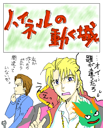 掲示板のほうでお邪魔したばかりなのに、こっちにも失礼します。 といきゃっとさん!ハ○ルはGH変換OKですよ! ダメなんかじゃありません。 映画を観終わったとき、早速グーがハイネルと一緒に空中散歩する姿を思い浮かべた私です(笑) ただ、問題はおじいちゃんにされるハイネルというのが・・・か、描けない・・・誰か可愛いおじいちゃんなハイネル描いてみてください(汗)むしろ女の子に・・・とか思った腐った私ですが、それもまたどうなの;ということで、妄想は空中散歩で終わってしまいました(^^;) でも、といきゃっとさんの言葉で改めてちょっとらくがきする気になってしまったので。またデカ絵で失礼しました里見さん・・・。 あ、こんなところで何ですが、サッカー漫画のハチマキはそうです、光くんです♪ さて、らくがきですが; 一番、力を入れたのは絵じゃなくてロゴ(笑) 一番、気に入っているのは火の悪魔な加賀ちゃんです。 描けなかったけど、かかしのランドルというのもいます。私的にこれは自信をもってお送りするキャストでございますよ〜。いかがでしょうか? って、なぜかWパロには食いつきのいい私です; 日々、普通のGHが思い浮かばなくなっていく・・・; そういえば、この絵を描くのにパンフを観ていて気付いたのですが、ヒロインの服が最初は緑なんですが、ハ○ルの元へ行く頃から青なんです!デザインは同じ服なのに・・・。これは、ソ○ィー・ハイネルがハ○ル・グーに染まったということでよろしいのでしょうか、監督! 最後に、里見さん・・・レス消えてしまったそうで;なんだか倍もお手数をおかけしてます(>-<)