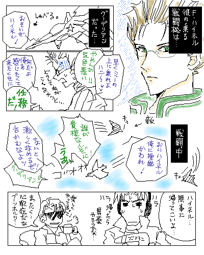 そうそう、山道って名前だったはず。「やまみち…」とか呟いて「ちが〜う!」と言われた記憶が。まだチラ見ですが、強くセクシーでした。読んだら又書き込ませていただきます。よれたマウス画で(←いい加減ペンタブ買え!) ヒロシ好きです。あの情けない感じが。 そして、わんこネタに笑わせてもらい、友人ネタに笑えないと笑ってみたり(笑ってるし) 私が描くと攻めハイネルに見えるのはヒューさんです。髪の毛つい立てすぎちゃう…。ハイネルの髪型で散々描いたのが手に染み付いてしまっているのでしょうか。いや、ヒューの髪型に慣れると、ハイネル描いた時に髪の毛がぺしゃんこになってしまうやもしれません……危険危険! そうそう、アメンの主役の声は野原ひろし(ク○ヨンしんちゃんのパパ)を演じている方です(笑)ひろしはともかく、シリアス声は鬼畜くさくていい(あ、またもや鬼畜攻め好きの血が…)そしてヒューの声なのですv で、里見さんグー好きですか?(笑) 私は最近物忘れがひどいんですが…同僚(男)のはまっていた特撮のキャラを「ホモくさい!(いや、すごい回があったもんで;)」「あの腕輪をあわせるとこは、ただの友達とは違うんだ」とか散々言ったらしいのですが、これ〜〜っぽっちも覚えてません。「そんなこと言ったっけ?」と言う私に、あんた悪魔だとか言ってましたが(失敬だな!)「そんな君だけど、きっと何年経ってもグーデリアンの事だけは忘れないんだろうねぇ…」と生暖かい目で見られました。 そりゃもちろん『グーは特別』だからね!!でも、あんまり仕事場の人をいじめて遊ぶのはやめようと思いました。ほんとに何話したんだか覚えてないし……
