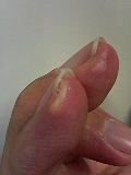 また火傷今度は水脹れになってしまいました。この程度ですが痛いの何のって… どうも今日は朝から寝坊したり、火傷したりとツキのない日のようです。 こんな日は家でおとなしくしているのが良かったのかな。 よく見たら爪がのびていますね。帰ったら切ろう。 [2006年10月20日(FRI) 22:16]