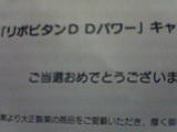 当選夏に応募したリポビタンDのキャンペーンに当たったようで品物が届きました。 当たったといっても「外れた中から抽選で」のオリジナルTシャツ。フリーサイズなので大きすぎ(半端じゃない)で着れません。 当たっておいて何ですがうれしくないかも… [2006年10月30日(MON) 18:50]