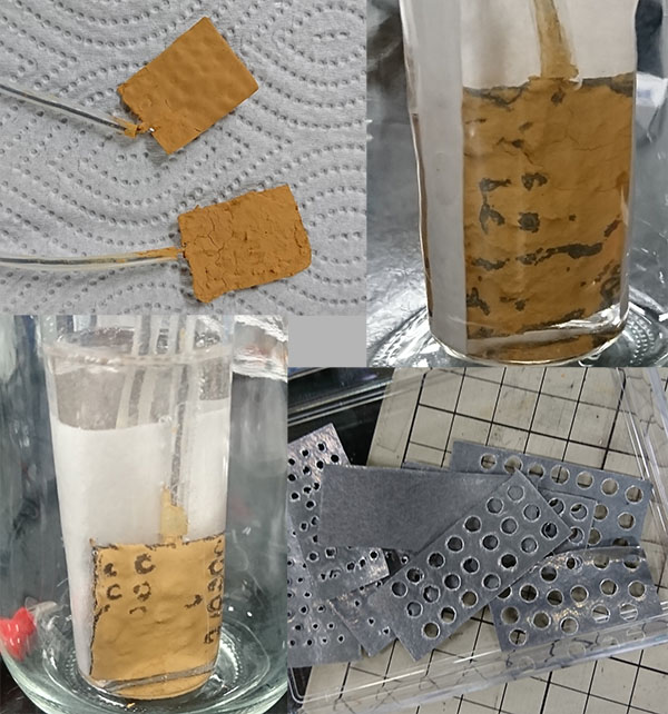 ところが、鉛は非常に柔らかい金属です。ゴムみたいな金属を、マイクロサイズの網目構造にできるはずがありません。先週知ったことなのですが、代替策として酸化鉛(II)すなわちPbOを使うらしいです。酸化物だったら固いので、粉砕して微粒子化して、適当な結着剤と混ぜて紙粘土みたいにして集電体に塗り付けることができます。私は両極の集電体である鉛板にドリルで無数に穴を開け、リード線として直径1mmの鉛ワイヤーをハンダ付けしました。すぐに酸化被膜ができるため、スポット溶接ではうまく付かなかったのですが、ハンダはさすがにすず―鉛合金なので、びっくりするほどよく付きます。これに結着剤としてpoly(vinylidene)difluoride (PVdF)、混合溶剤としてN-methylpyrrolidone (NMP) を含むPbOを塗り付けて150℃程度で真空乾燥させました。ちなみに塗るときにNMPの量をかなり細かく加減して、漆喰みたいにして穴あき鉛板にスパチュラで塗ります。